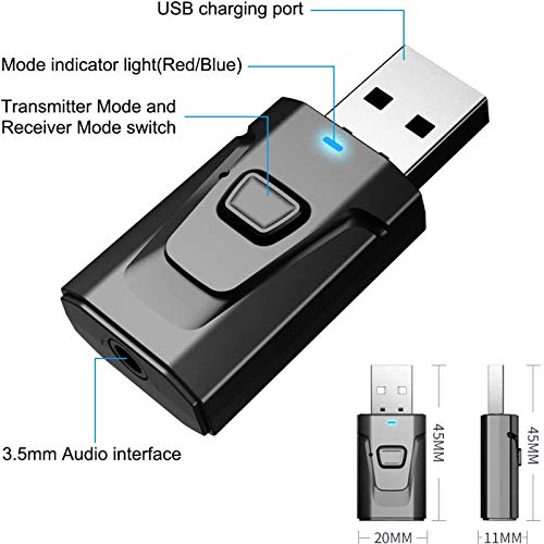【Trasmettitore & Ricevitore】2 in 1 Adattatore Bluetooth, ci sono 2 modalità (TX e RX), Adottare a avanzata Bluetooth 5.0, La modalità TX (luce rossa) è per il trasmettitore e RX (luce blu) è per il ricevitore. Premere brevemente il tasto funzione sul dispositivo, cercherà automaticamente il successivo dispositivo di ricezione audio wireless. Nome Bluetooth: Wireless Music Adapter