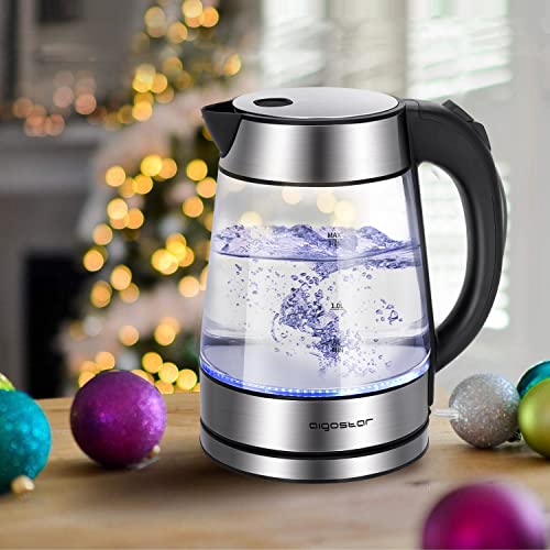 Aigostar Chubby - Bollitore Acqua Elettrico in Vetro Borosilicato con LED, 1.7L, 2200W Teiera Elettrica, Filtro Rimovibile, Spegnimento automatico, Base Rotazione a 360° in Acciaio Inox. Senza BPA