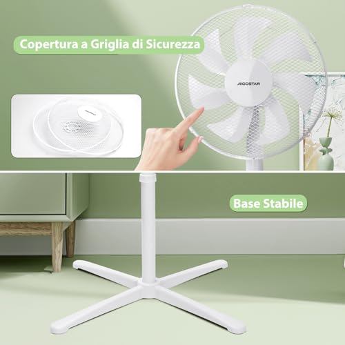 Aigostar Daisy Ventilatore a piantana Motore statico antirumore 40W Ampia pala 41 cm Grande volume d'aria, Base stabile Altezza regolabile. 3 velocità Facile da riporre Bianco