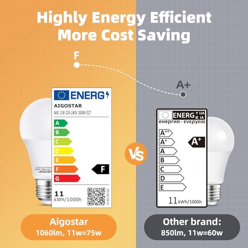 【Specifiche】Lampadine LED con attacco E27.Il regolamento UE sull'etichettatura energetica reintroduce una classificazione più semplice, utilizzando solo le lettere da A a G. I nostri prodotti sono conformi al regolamento quadro UE sull'etichettatura energetica, la classe di efficienza energetica F corrisponde ai precedenti prodotti A+, addirittura migliore dei prodotti A+.