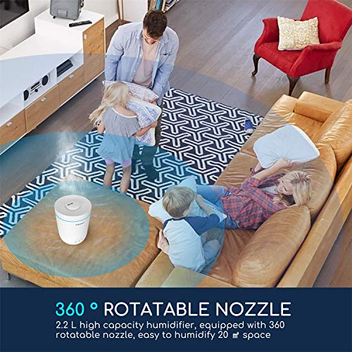 【UMIDIFICAZIONE EFFICIENTE】 L'umidificatore di grande capacità da 2,2 litri può idratare l'aria fino a 150 ± 20% ml / h, consentendo un massimo di 22 ore di lavoro in funzionamento continuo a bassa nebbia.L'umidificatore rinfresca e idrata l'aria per ambiente da 20m². Adatto per qualsiasi ambiente come grandi stanze, camere da letto, camerette ecc. Produce una nebbia omogenea e uniforme, non causa l'accumulo di acqua sui mobili o pavimento.
