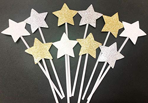 AILEXI 10 Pezzi Toppers Decorati A Mano con Decorazione Glitter per Torta Cuptorta E Gelato - Stelle Oro e Bianco e Argento