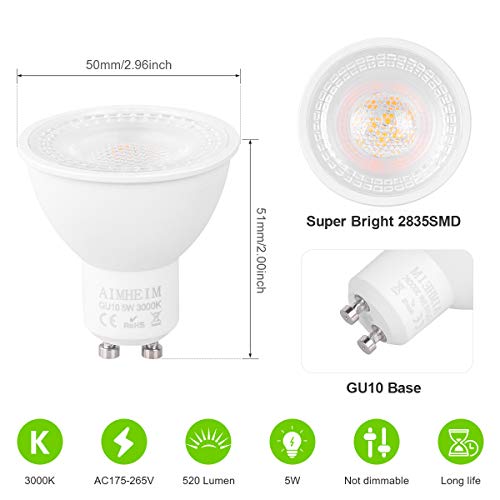 AIMHEIM Lampadine LED GU10 5W Faretti GU10 Luce Bianca Calda 3000K, 520 Lumen, 5W Equivalenti a 50W Lampadine Alogene, Angolo 60, Illuminazione LED, Non Dimmerabili, Nessun Sfarfallio, 6 Pezzi