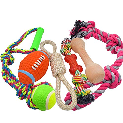 AINOLWAY Medium Large Dog Rope Toys 6 Pack Set, 4 Sturdy Rope Toy with Ball and Handle for Tug of War & 1 Wooden Dog Bone & 1 Squeaker Football, Assortment For Large Breeds and Big Puppies