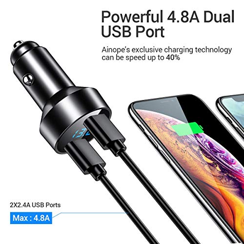 AINOPE Caricabatteria auto USB, 4.8A Caricatore adattatore universale 2 Porte con voltmetro digitale a LED (Materiale in lega di alluminio) per iPhone, Smartphone e gli altri dispositivi USB (Nero)