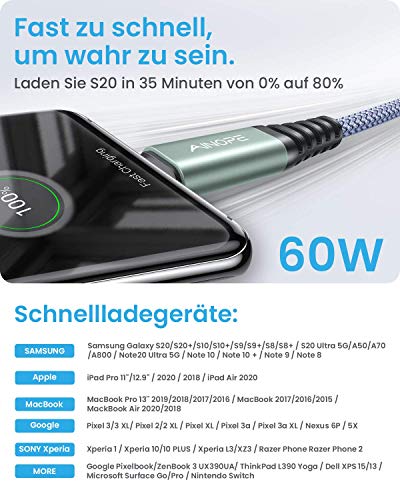 AINOPE 2 Pezzi 2M Cavo da USB a USB c, PD/QC 60 W Cavo di Ricarica in Nylon da USB c a USB c, Compatibile con Samsung Galaxy Note 10 + S10 S9 S8 Pixel 2/3/4 XL