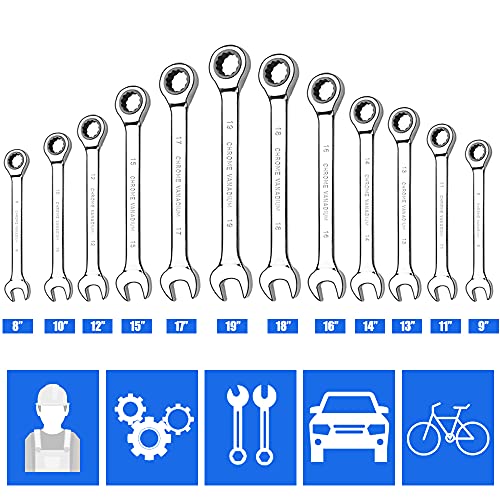 AIRAJ Chiavi a Cricchetto -12 pezzi, 8-19 mm, kit metrico standard professionale, cromato, Tote Bag, progettato per artigiani esperti,Professione Set Chiavi cricchettoco mbinata 72 denti