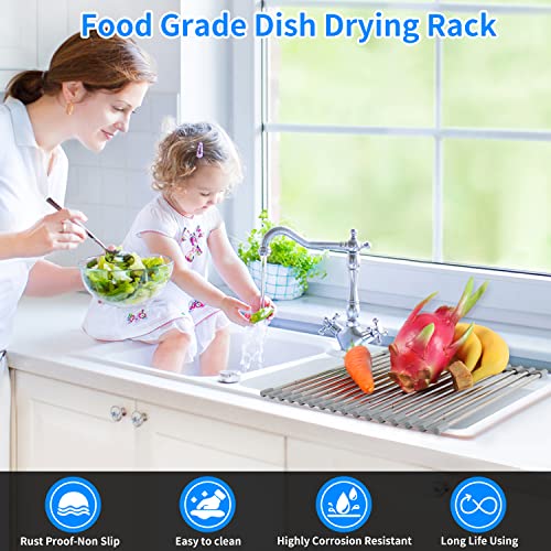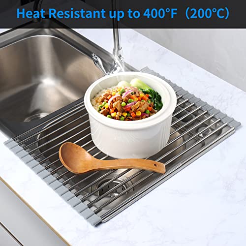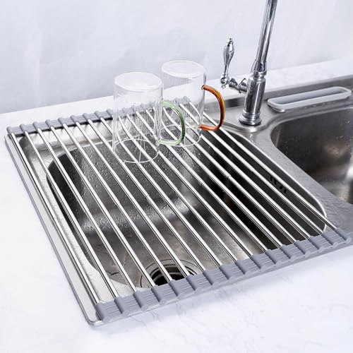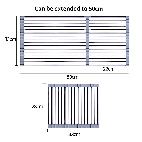 AIRUJIA Griglia Scolapiatti Arrotolabile, Pieghevole Sopra il Lavello, Portatile Multiuso da cucina, per Asciugare Ortofrutticolo, Espandibile Fino a 33x(28 - 50) cm, Grigio