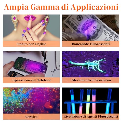 ✨【Ampia Applicazione】- La lampada UV per unghie è applicabile per la polimerizzazione rapida dello smalto per unghie, ed è anche ampiamente utilizzata per la riparazione dei circuiti dei telefoni cellulari, per il rilevamento di agenti fluorescenti, per la vernice fluorescente, per l'arte della resina e per il rilevamento delle macchie. Regalo perfetto per i vostri amici o parenti che amano i saloni per unghie a Natale, il Giorno del Ringraziamento e San Valentino.
