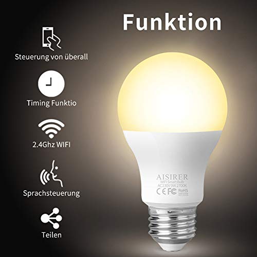 Aisirer, lampadina a LED Smart E27, Wi-Fi, dimmerabile, 10 W, luce bianca calda, funzione timing, compatibile con Amazon Alexa, Echo Dot, Google Home, nessun hub richiesto, lampadina da 2700 K (2 pezzi)