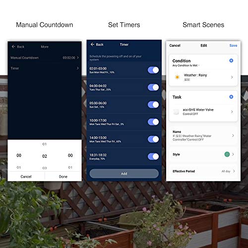 【Imposta timer / conto alla rovescia manuale】 Possiamo impostare i timer per accendersi / spegnersi ad un'ora specifica con la specifica posizione aperta della valvola per ogni giorno per rendere l'irrigazione più efficace. Possiamo anche impostare un conto alla rovescia manuale su APP