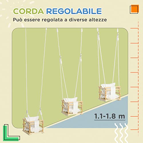 AIYAPLAY Altalena per Bambini 9-36 Mesi in Legno e Cotone per Interni ed Esterni con Corda Regolabile e Cuscino Rimovibile, 30x30x110-180 cm, Color Legno e Bianco