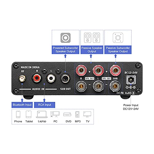 Canale multiplo: uscita multicanale a 2.0 canali/2.1 canali/2.2 canali, canale sinistro e destro 50 W + 50 W, subwoofer 100 W, con Bluetooth 5.0, ricevitore Bluetooth di alta qualità. E l'interno utilizza 2 amplificatori operazionali NE5532, uno per sinistra e destra uscita del canale, uno per l'uscita del subwoofer