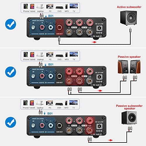 La struttura separata lo rende multifunzionale: può essere collegato indipendentemente a una coppia di altoparlanti stereo o un subwoofer, ed è stata aggiunta un'uscita a bassa frequenza appositamente per gli utenti che hanno solo un subwoofer attivo facile da costruire. Sistema audio a 2.0 canali / 2.1 canali / 2.2 canali come preferisci.