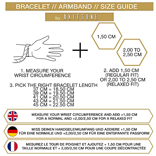 Dimensioni: il bracciale è disponibile in 3 misure - 37 cm, 39 cm o 41 cm di lunghezza totale. Troverete la vostra taglia giusta in base alla tabella delle taglie nelle immagini per l'offerta. Si prega di evitare il contatto con l'acqua per una lunga durata del cinturino.