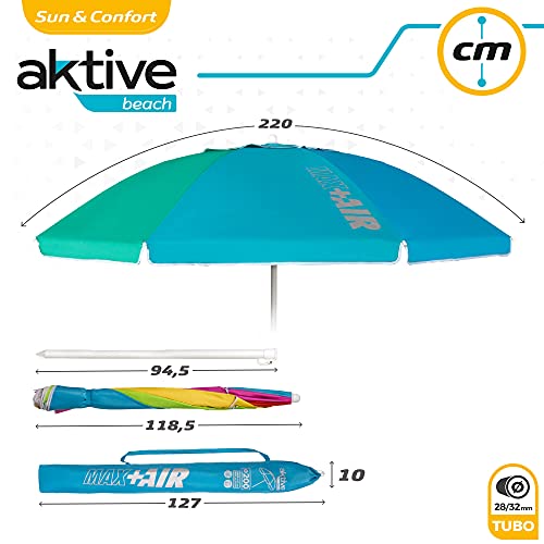 AKTIVE 62222 - Ombrellone da spiaggia, 220 cm, grande ombrellone, tetto di ventilazione, manico 28-32 mm, protezione UV 50, design multicolore, con borsa per la conservazione, Beach