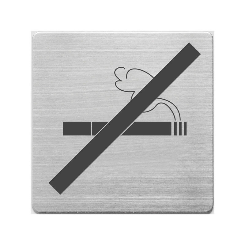 Icone autoadesive in acciaio inossidabile spazzolato opaco di alta qualità con stampa nera, modello quadrato con angoli arrotondati, stampa: No smoking, dimensioni 90x90x1 mm.