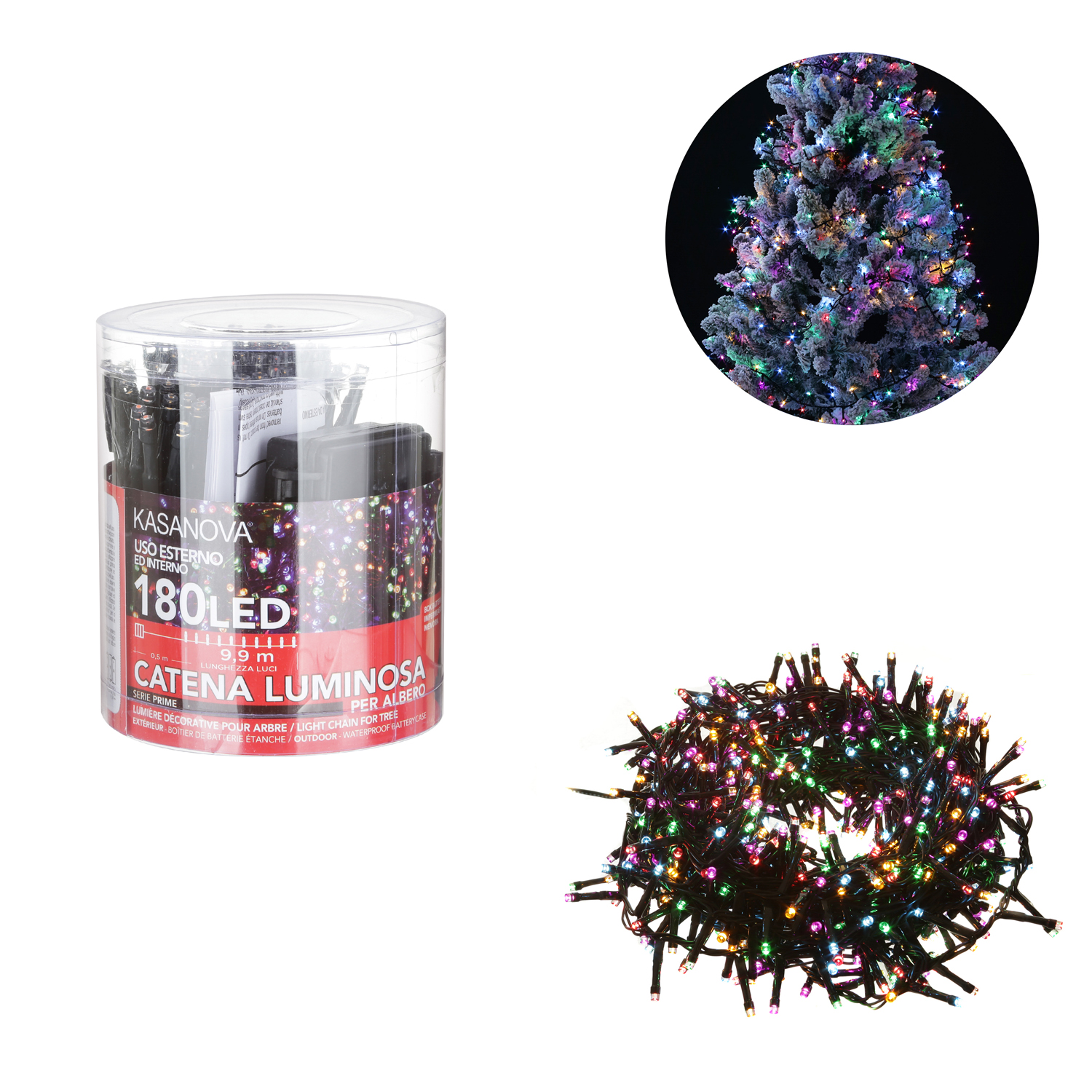 Crea una magica atmosfera con questa catena luminosa a luce colorata, adatta sia per interno che per esterno. Il filo di luci è facile da posizionare sui rami del tuo albero di Natale e grazie al controller integrato puoi impostare e memorizzare 8 diversi giochi di luce per un effetto davvero suggestivo! Potrai utilizzare i 180 led anche per arricchire il tuo presepe e altre decorazioni sia in casa che sul balcone o in giardino. Le luci natalizie funzionano con batteria resistente all'acqua, con 3 pile AA non incluse. L'estensione della catena di luci copre 9,99 metri ed è composta da cavo verde di 0,5 metri. Confezionate in scatola trasparente per riporle in ordine alla fine delle festività.