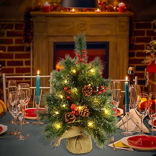 Albero natale piccolo con luci,20 inch Mini albero di Natale artificiale preilluminato con luci a LED calde, ornamenti di pigne con bacche rosse per decorazioni natalizie per interni domestici