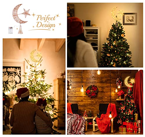 Albero di Natale Topper,Rosa Oro Stella Di Natale A Forma Di Luna e Stella,Puntale Albero di Natale,Glitterato con Luci Integrate Natalizie Albero Luci Calde Natale Punta per Albero di Natale,30cm