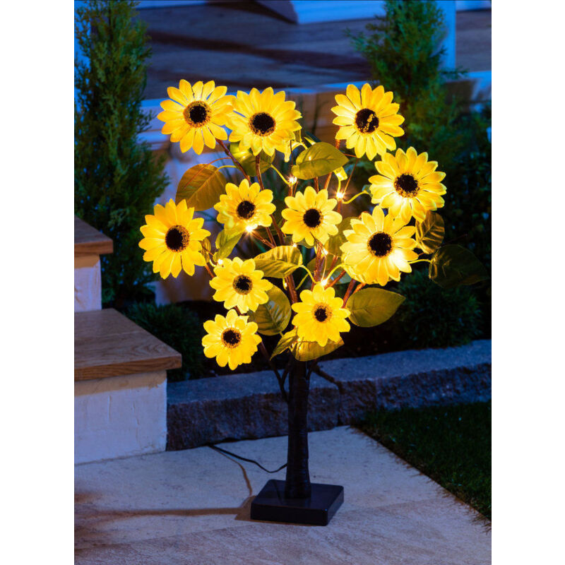 Albero solare a LED con girasoli - 60 cm - Lampada da giardino con effetto floreale Albero luminoso estivo con girasoli circa 60 cm alimentato ad energia solare Dati articolo: La dimensione è di circa 60 cm x 40 cm x 40 cm (altezza x larghezza x profondità) Materiale: plastica Colore: multicolore Emissione del colore: bianco caldo Albero LED ad energia solare con girasoli Lunghezza della linea di alimentazione al modulo solare ca 50 cm La consegna include la batteria (1x AA 1,2 V Ni-Mh) Interruttore on/off sul vano batteria Fornitura: 1x albero solare a LED - girasoli