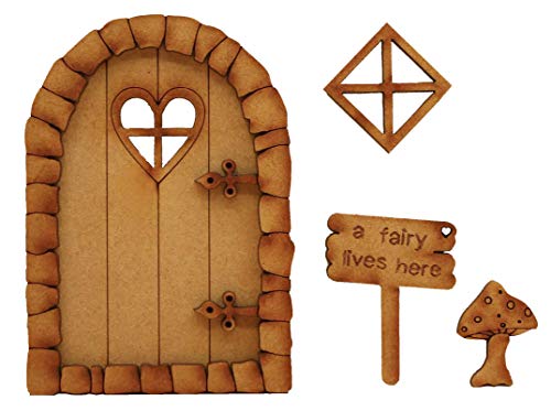 Set fatato Pebble Heart, 3D, kit da montare che comprende: porta fatata con spioncino a forma di cuore a linee incrociate, telaio della porta fatto di sassolini, con cardini a forma di foglia, un accessorio decorativo a forma di fungo, un cartello con scritta in lingua inglese “A fairy lives here” e una finestra fatata separata a forma di diamante.