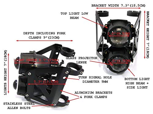 Ben fatto e molto solido: scocca in plastica ABS / staffe e morsetti forcelle in alluminio di alta qualità / luce in alto: anabbagliante e luce laterale / luce parcheggio/ luce inferiore: abbagliante.