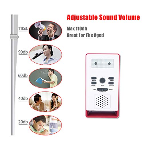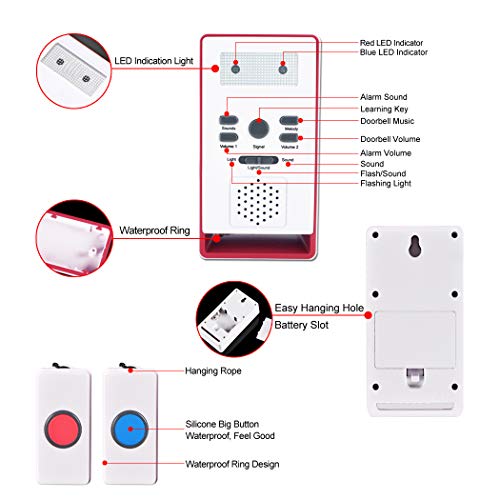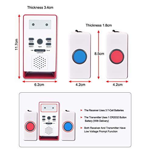 1, ideale come allarme per coloro che hanno bisogno di aiuto rapido, come anziani, bambini, portatori di handicap, donne incinte o malati. Dal momento che il badante non può sempre stare con pazienti o disabili, è sufficiente premere il pulsante di chiamata per ottenere cure tempestive e premurose. Il pulsante di chiamata rosso attiva 9 suoni di allarme di emergenza, mentre il pulsante di chiamata blu attiva 36 suoni di melodia.