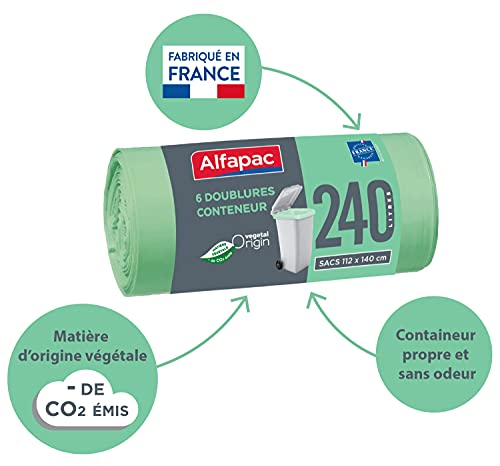 ALFAPAC - 6 sacchetti foderati per pattumiera arrotolata 240L - Sacchetti per la spazzatura da container - Ecoresponsabile - 112 x 140 cm - Made in France