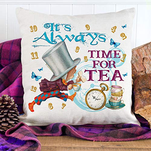 Cuscino con federa di Alice nel paese delle meraviglie, con scritta in inglese "Time for Tea" e disegno del Cappellaio Matto, 40 x 40 cm, con inserto/cuscino.