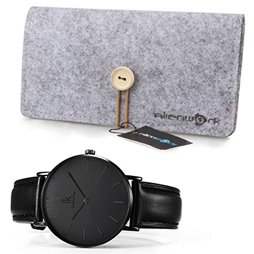 Alienwork IK All Black Orologio Uomo Donna Nero Bracciale in Cuoio Ultra-sottile