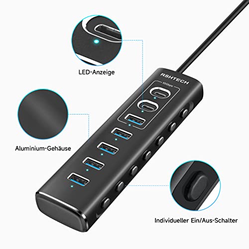 Hub USB Alimentato RSHTECH Hub USB 3.2/USB C a 7 Porte con 3 porte USB 3.2 da 10Gbps (2*Type-C, 1*Type-A), 4 Porte USB 3.0 * 5Gbps, Cavo Dati da 1m, Alimentatore da 24W, Hub USB C, RSH-A107C