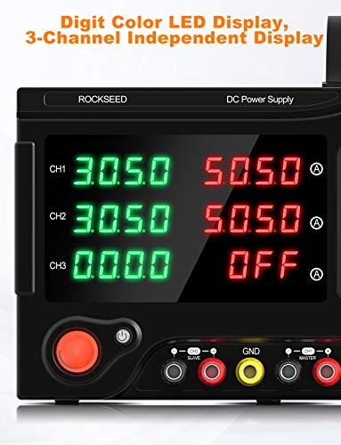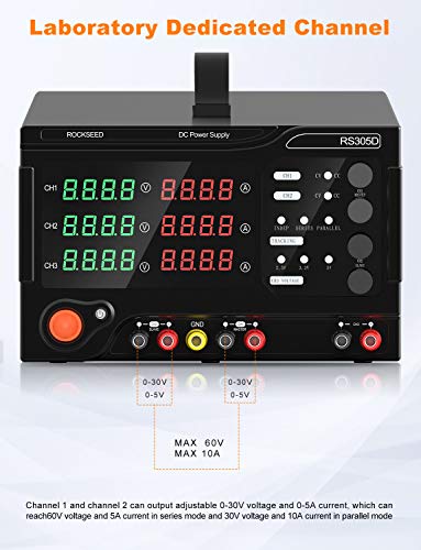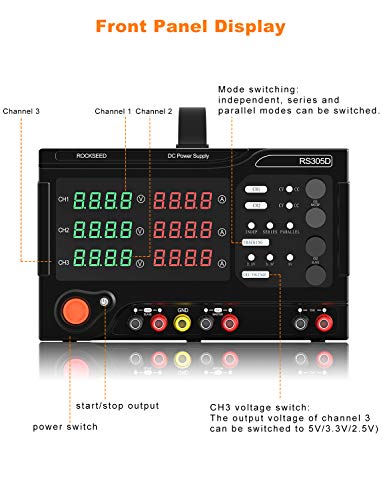 Uscita a tre canali: il canale 1 e il canale 2 sono dotati di tensione da 0 a 30 V, funzione di uscita regolabile da 0 a 5 A. Il canale 3 ha una corrente massima di 5A e una tensione di uscita regolabile di 5 V/3,3 V/2,5 V, che offre comode opzioni di tensione per gli esperimenti sulla tensione dei chip e dei circuiti TTL.