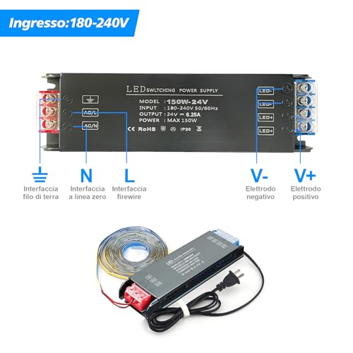 【Specifiche del trasformatore LED】: Ingresso: 180-240V AC, 50/60Hz. Uscita: 24V DC 6.25A 150W, bassa ondulazione, nessun cavo incluso.