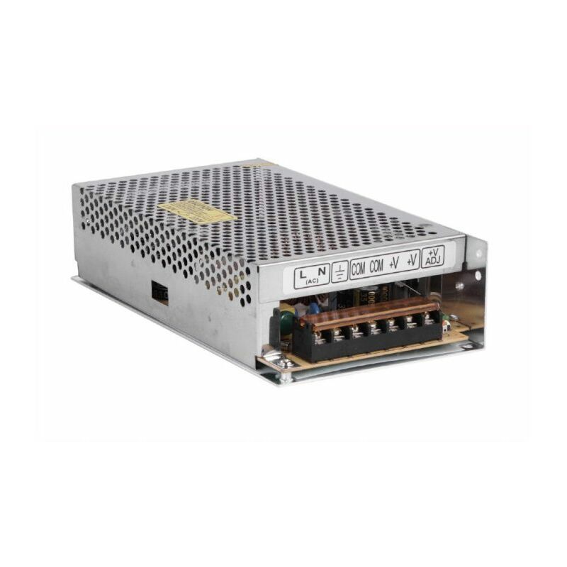 Alimentatore stabilizzato switching con tensione di uscita di corrente 24V a 5A ed entrata 220V. Fornisce la giusta tensione per l'accensione e il funzionamento di luci e illuminazione LED ed ogni altro dispositivo che lavora a bassa tensione 24V
