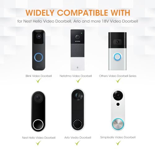 Con un'uscita CA di 18V 500mA e un cavo super lungo 15 piedi, nessuna preoccupazione per l'adattatore di alimentazione non è abbastanza lungo per collegare la presa al campanello. Perfettamente compatibile con Nest Campanello (batteria), Nest Hello Video Campanello, Arlo Video Campanello, Eufy Video Campanello, Blink Video Campanello, Simplisafe Video Campanello, Ezviz Video Campanello e altri Campanelli necessari Trasformatore da 18 V.