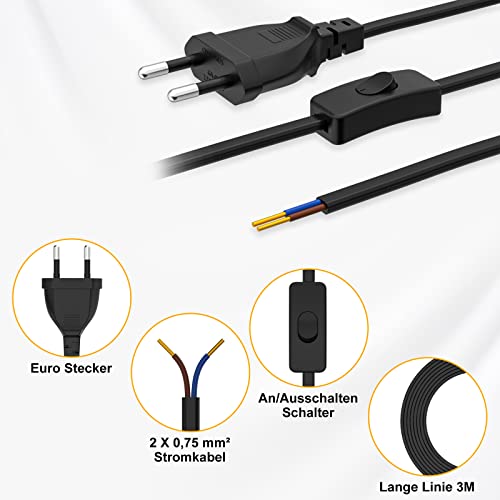 Cavo di Alimentazione Euro con Interruttore [2 pezzi], 3 Metri di Cavo di Alimentazione, 2 Cavi di Ricambio con Interruttore Tipo C, 2 x 0,75 mm², per Luci, Lampade, Lampadine, Nero