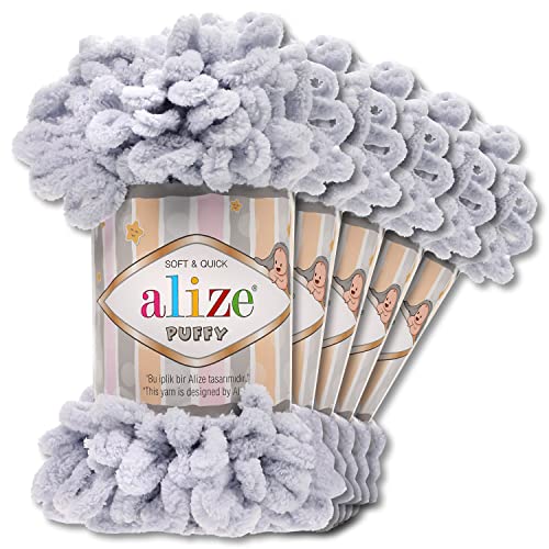 Alize - 5 gomitoli di lana di ciniglia Puffy da 100 g per uncinetto e lavoro a maglia senza strumenti per vestiti, accessori, coperte, tappeti, 416, colore grigio chiaro