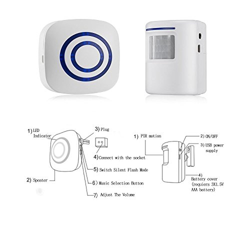 Campanello wireless: portata fino a 70 metri (distanza tra il sensore e il ricevitore), e il raggio di rilevazione del sensore (la distanza di rilevamento PIR) è circa 3-8 metri.
