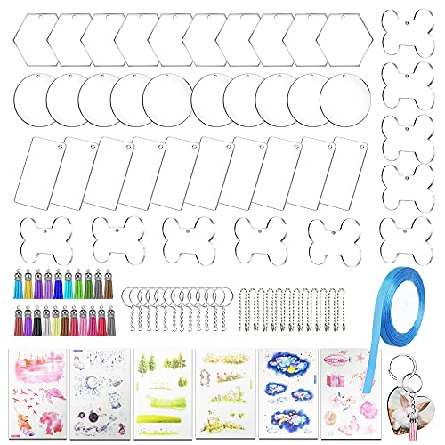 Portachiavi in acrilico a 4 forme set fai da te: 40 pz di spazi vuoti in acrilico trasparente, 20 pz di portachiavi in 2 stili, 20 pz di catena a sfera, 20 pz di mini nappa, 1 rotolo di nastro, 6 pz di adesivo in motivo casuale. Ottimo per progetti in vinile, artigianato fai-da-te e realizzazione di portachiavi.