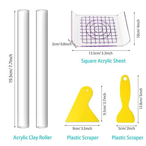 Il rullo di argilla e il pannello di supporto sono solidi cilindrici, sono fatti di acrilico, la superficie è liscia e non appiccicosa. Raschietti per argilla in gomma, che promettono una lunga durata. Questi raschietti sono strumenti indispensabili per contornare, modellare, levigare, appiattire e tagliare l'argilla e altri materiali di stampaggio.
