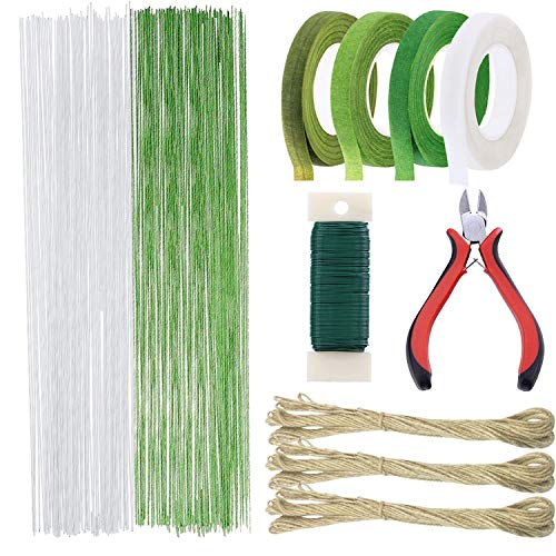 Kit di composizione floreale: 4 rotoli nastri floreali in 4 colori (bianco, verde chiaro, verde, verde scuro), 200 pz 60 cm filo gambo floreale 26 gauge in 2 colori (bianco e verde), 3 pz di corda di canapa (10m ciascuno, totale 30m ), 1 pz taglia filo floreale, 35m verde paddle wire 22 gauge.