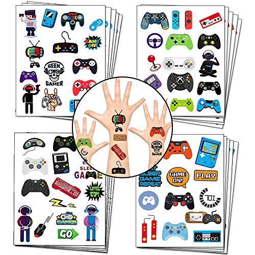 Forniture per feste di videogiochi per giocatori: simpatici tatuaggi giocano alla festa, 20 fogli X 300+ modelli, diversi tipi di modelli possono essere indossati braccia, volti, mani ovunque tu voglia un tocco di glamour! Aggiungi atmosfera alla tua festa di videogiochi.
