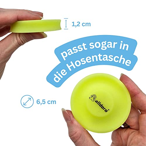 Il set di mini dischi gialli di alldoro sorprende immediatamente bambini e adulti. I 3 dischi per frisbee hanno un diametro di 6,5 cm e grazie all'effetto bagliore brillano al crepuscolo