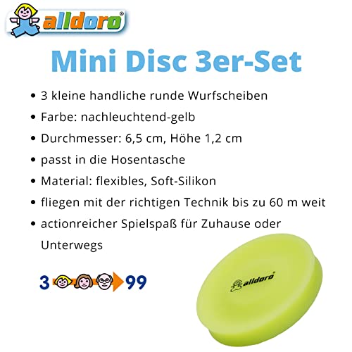 Alldoro 63050 - Set di 3 mini dischi da lancio con effetto bagliore, disco Ø ca. 6,5 cm, in morbido silicone, flying disc piccolo, gioco fino a 60 metri, per bambini, adulti e cani, giallo