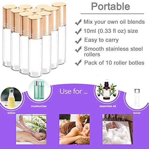 Alledomain 10 bottiglie di olio essenziale trasparente da 10 ml, ricaricabili in vetro trasparente, rotolo su bottiglie con sfere in acciaio inox e tappo dorato, include etichette, contagocce e apri