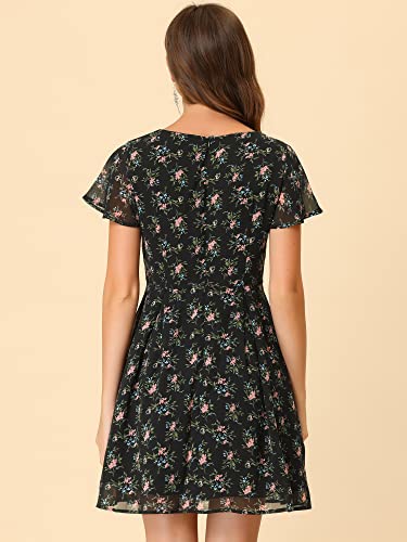 Allegra K Abito da donna in chiffon con scollo a V con scollo a V con maniche a volant floreali, Floreale nero, 44