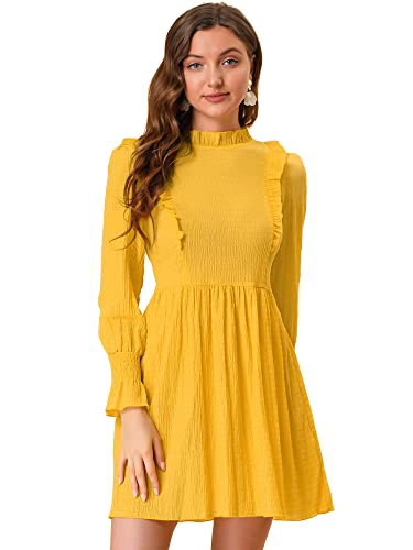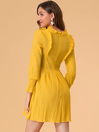 Allegra K Abito Tinta Unita Mini Donna Vestito Manica Lunga a Sbuffo Elastica Scollo con Volant Giallo M