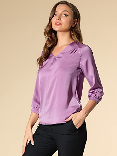 Allegra K Tee Blusa Tinta Unita Donna Camicetta in Raso Scollo a V Manica Lunga Camicia Casual Comodo Business Viola S