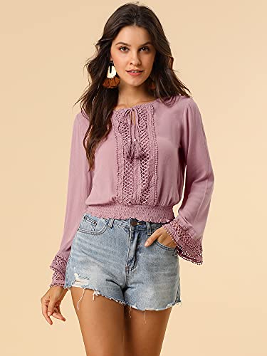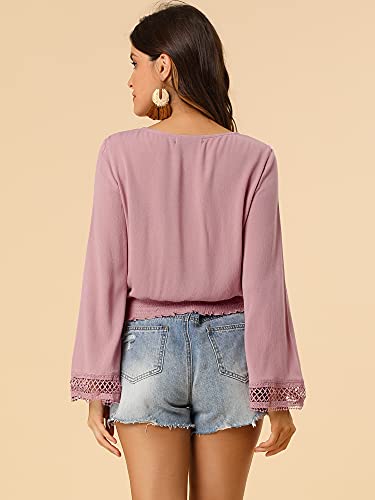 Allegra K Camicetta da spiaggia Boho manica a campana pizzo Trim cravatta collo contadino smocked top da donna, Rosa polvere, 40